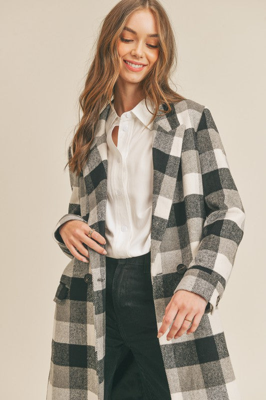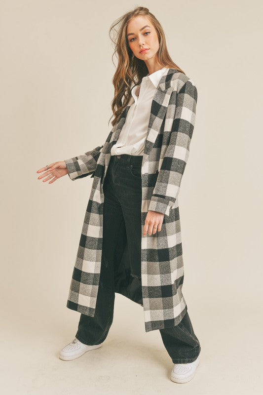 Midi length plaid coat + Notched lapel + Front button closure + Long sleeves + Lined + Pockets + Model is 5' 9" 32-24.5-34.5 and wears a S