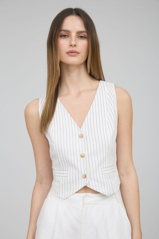 Elevate your wardrobe with this sophisticated pinstripe vest top, featuring a classic button-down front and an elegant back tie detail. Its tailored fit and refined stripes create a polished look perfect for layering or wearing alone, offering versatile style for both professional and chic casual occasions.